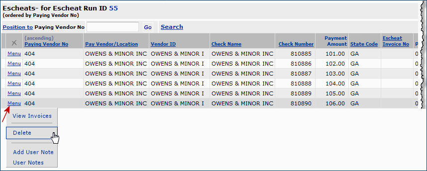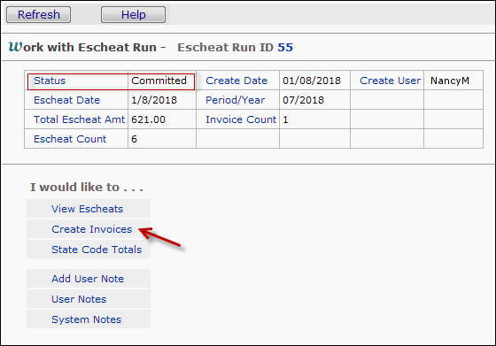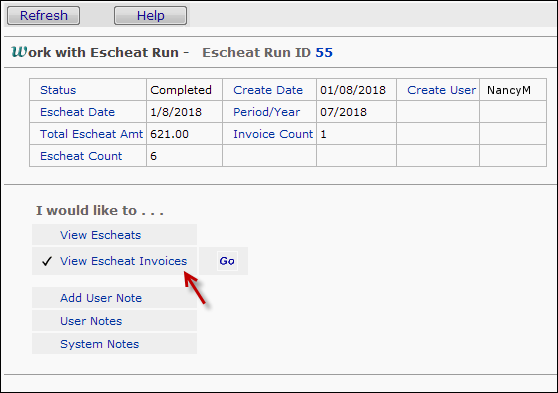 3. Click View Escheat Invoices and Go to display a list of invoices in the run.