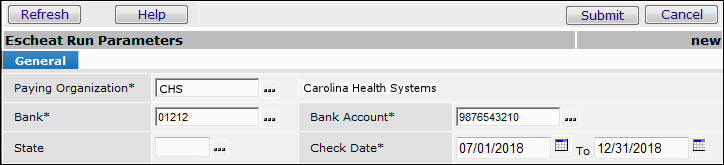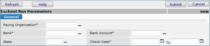 The Escheat Run Parameters panel appears (Figure 67). Enter values in the panel fields to select the uncleared checks for which you wish to create escheat payments.