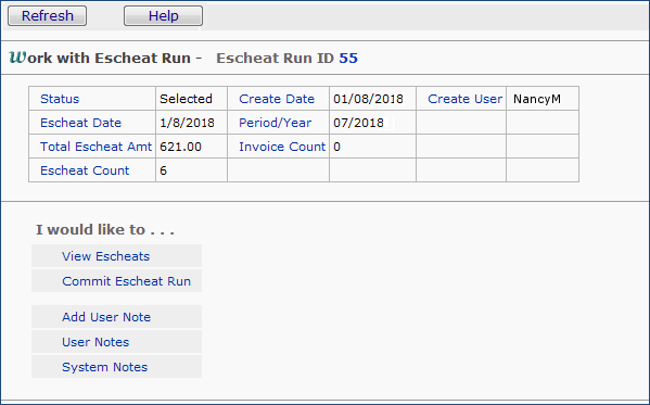 2. Locate the escheat run of interest and click w to work with the escheats in the run. The Work with Escheat Run panel appears.
