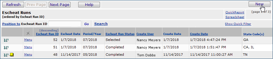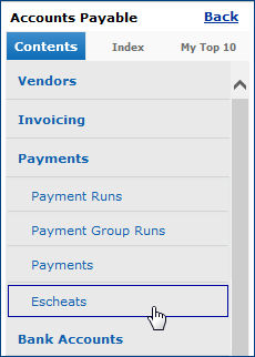 1. From the Accounts Payable main Contents, select Payments > Escheats. The list of escheat runs appears.
