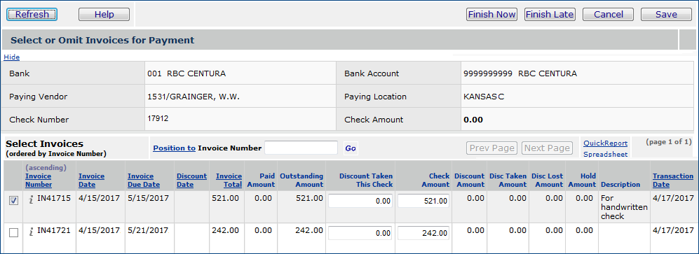 Check Register Details - Displays check details including: bank and bank account, check number, date, amount, payee, payee vendor number, whether the check was later voided, whether the check was handwritten and invoice data (if relevant): the invoice number, invoice date, the outstanding amount, held amount, discount amount, and payment amount.