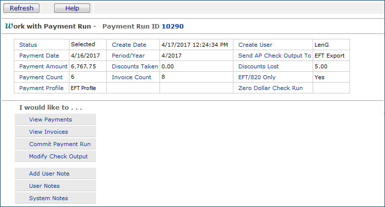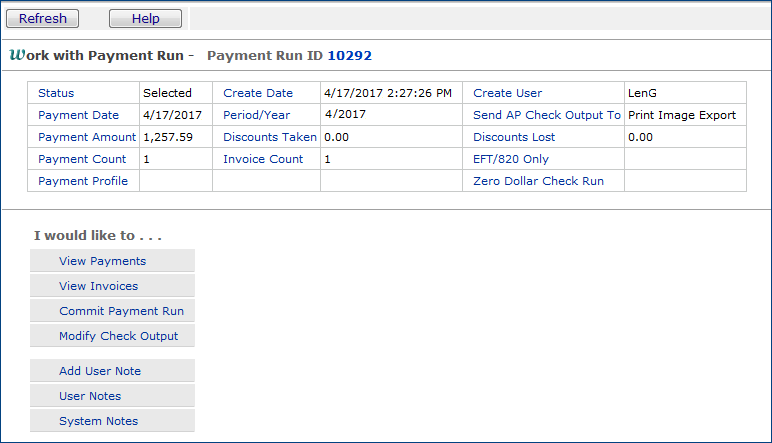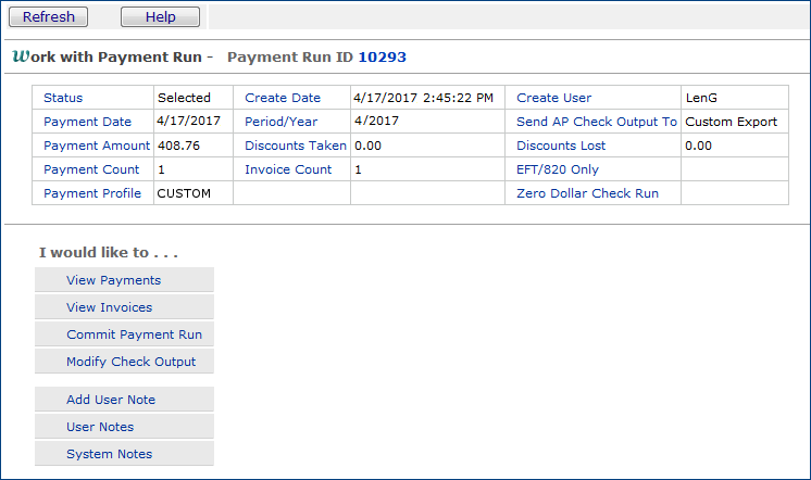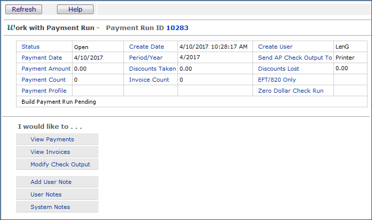Building a payment run generates payments for selected invoices. You specify the criteria that the system uses to select the invoices. A payment run can contain multiple payments for a set of invoices -- for example, if the invoices are from different vendors -- or only one payment. Note that a payment run can contain as few as one invoice and one payment. Once the payment run is built, you can view and adjust any of the individual payments, or exclude payments.