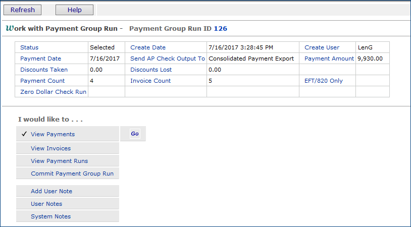 - All payments that are equal to or less than zero are dropped (deleted). If, as a result, the payment run has no payments, the system automatically sets the payment run Status to Completed, and writes a system note.
