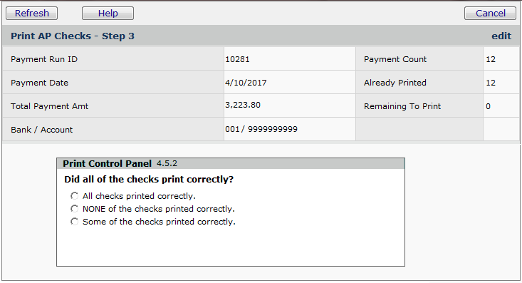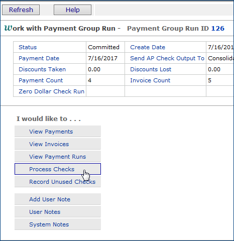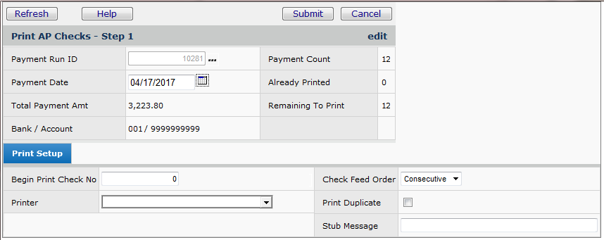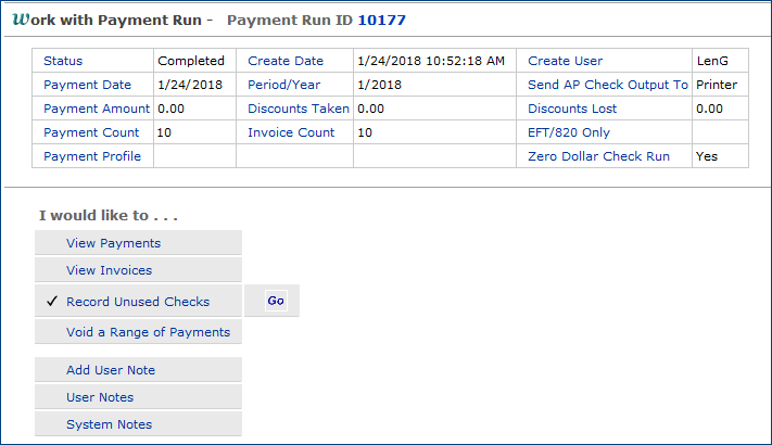 - Any payments with a zero dollar amount that remain on the payment run are processed as normal checks and can be printed and completed.