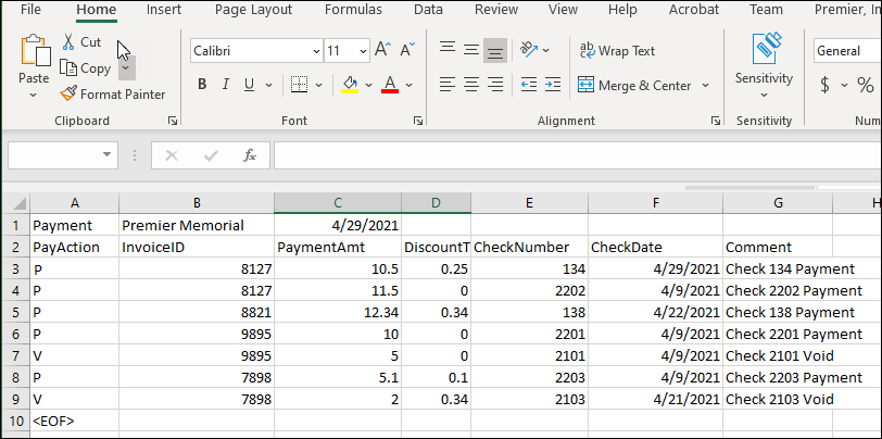 Figure 77 - A Sample Payment Import File Displayed in Excel
