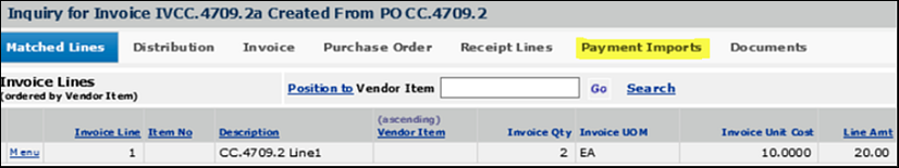 For invoices whose payments are imported from an external system, the Invoice Inquiry panel contains a new tab: Payment Imports. This tab displays data from the import (Figure 80).
