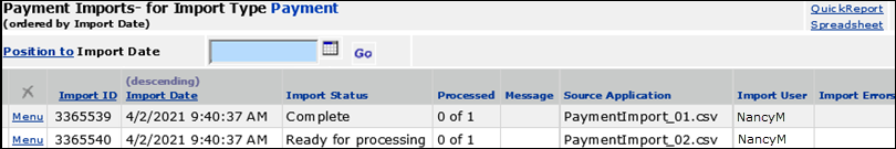 Figure 79 is an example of the Payment Import list with several imported files. From the Menu, you can reprocess a file, open a file and view the import details, download a file to a network location, or delete a file.
