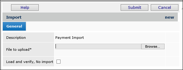 Materials Management main Contents (or GL) > Imports/Exports and Financials > Payment Import > New