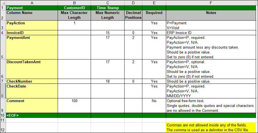 Figure 76 contains the format and fields for the .csv payment upload file. You must save the file as a .csv. The last line of the file must contain EOF, by itself.