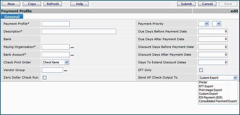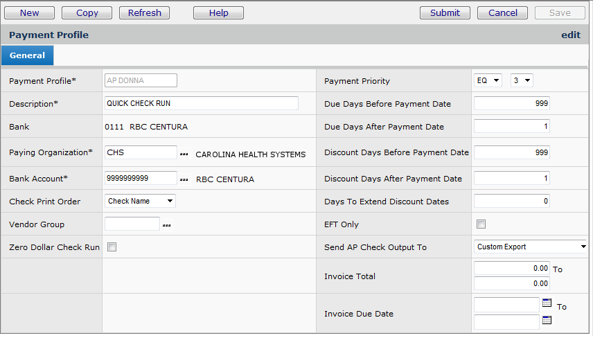 You may specify a Payment Profile for a payment run. Payment profiles are defined in the Accounts Payable Tables. A payment profile contains defaults for values such as check processing method. Payment profiles also define the characteristics of invoices selected for payment, for example: