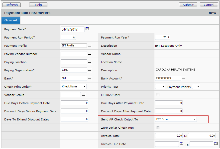 On the Payment Run Parameters panel, when you select a Payment Profile from the prompt, the system completes several fields with values from the payment profile. If the Vendor Pay-To Location uses EFT (electronic funds transfer) for payments, a payment profile is not required but can be used to provide default values.