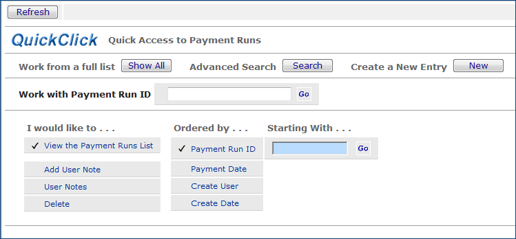 1. From the Accounts Payable main Contents, select Payments > Payment Runs.