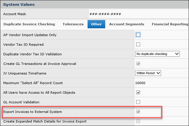 Figure 75 - Setting a System Value to Export Invoices to an External Payment System