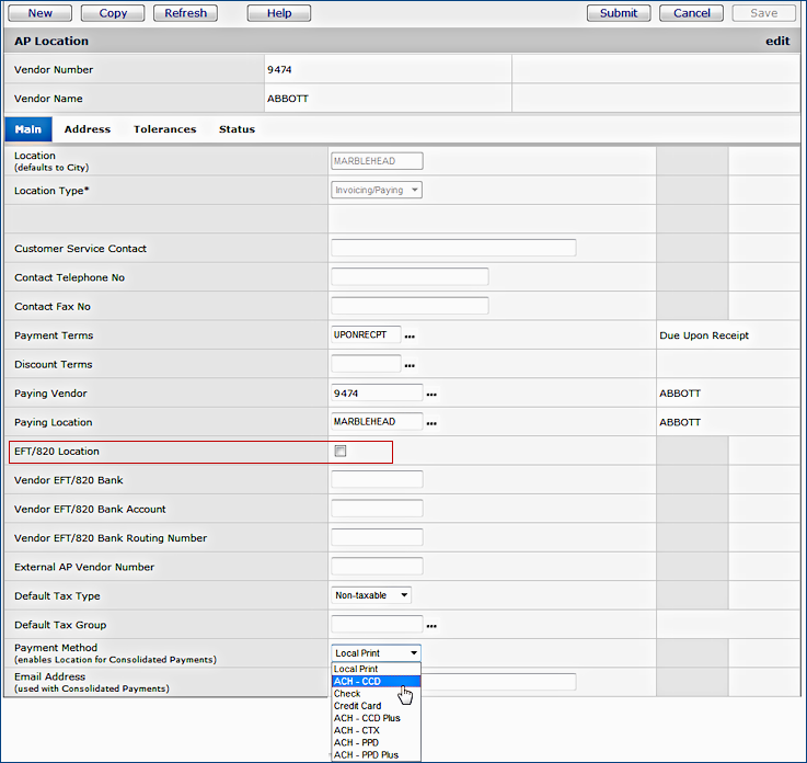 See Working With Vendor Information for details on editing vendor AP location records. For EDI 820 documents, see Using EDI 820 Payment Documents.