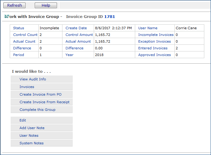 1. On the Work With Invoice Group panel (Figure 5), select Complete This Group. (Completing an invoice group approves the group and makes the invoices available for payment.)