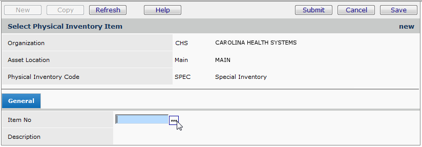 2. Click New. The Physical Inventory panel appears (Figure 1).