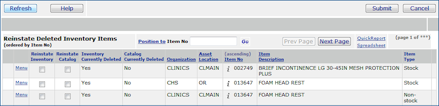 Note: You cannot reinstate an item in an asset location's item inventory if the item is deleted from the Item Catalog. You must first reinstate the item in the Item Catalog.