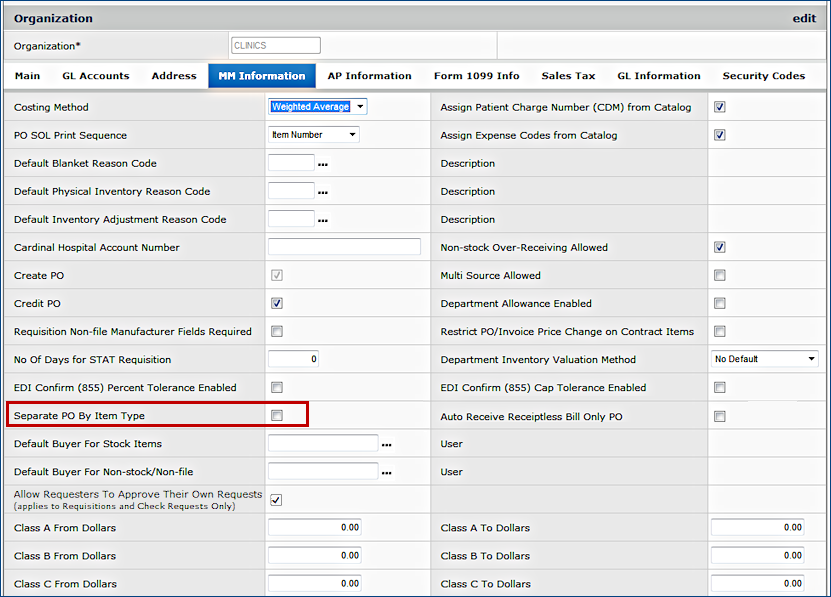 An organization or vendor may wish to separate stock items and non-stock/non-file items on purchase orders. To separate POs by item type, if required by a vendor, select the check box on the vendor Buy-From Location panel, shown in Figure 2, next to the gold star. If the organization requires separate POs by item type, select the field on the Organization panel's MM Information tab, as shown in Figure 10.