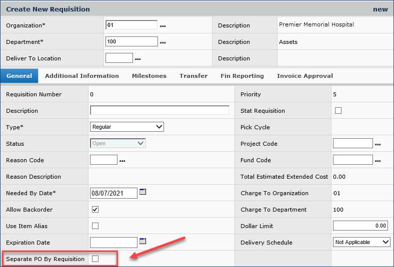 Note: The system will not create a purchase order for a vendor-designated "separate PO by department" item when an asset location itself is the requisitioning Department.