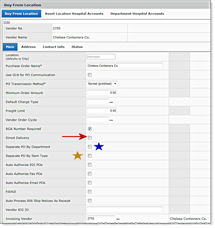 You can specify a department or a vendor buy-from location as direct delivery. You use the Direct Delivery check box on the Department panel to set direct delivery for a department (Figure 1, next to the red arrow). Similarly, the Direct Delivery check box on the Vendor Buy-From Location panel sets direct delivery for a vendor buy-from location (Figure 2, next to the red arrow). (We will discuss the field next to the blue stars and the gold star below.)