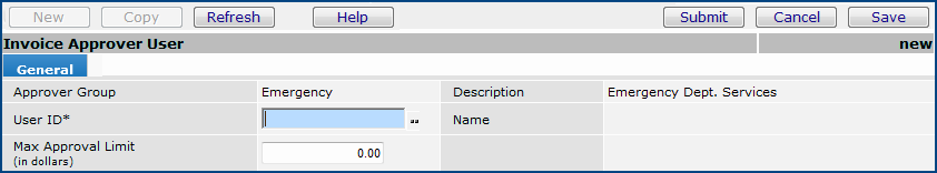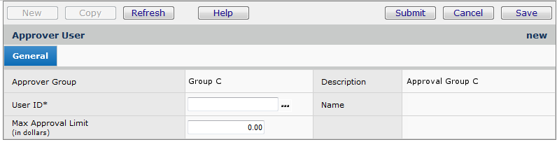 - Complete other fields on the panel. For example, when you add an approver to one or more approver groups, you must specify the approver's dollar limit. When you change the dollar limit for an approver, you must enter a new dollar value.