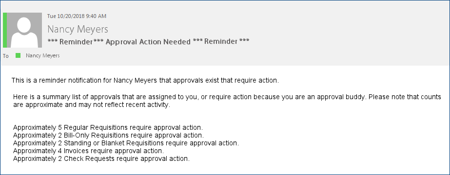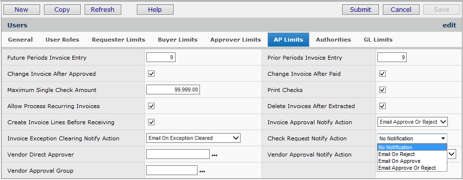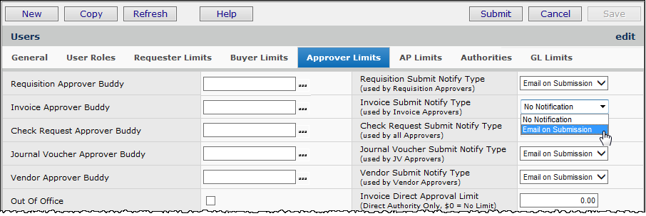 As described subsequently, approvers must be designated as such on their User Profiles. Approvers are assigned approval limits (dollars). You can also set related approval characteristics, such as how the approver is notified when an element requiring approval is available. Each approver can be assigned an Approver Buddy who handles approvals when the normal approver is out of the office.