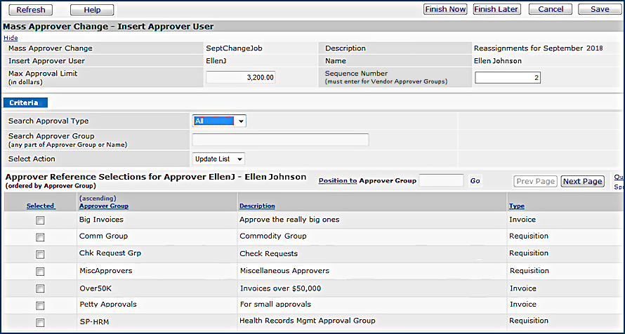 The last step is clicking either Finish Now or Finish Later. When you are changing maximum dollar limits, clicking Finish Now updates the approver groups that you selected for the user with the new dollar limit.