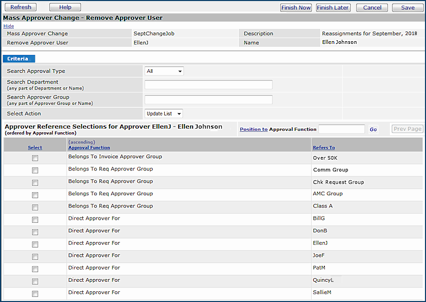 The mass approver change feature lets you make mass changes to approvers in approver groups.