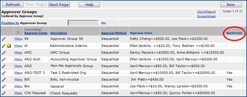 - Search Approval Type  lets you select a filter for the bottom list. Options are: all types of approver groups, invoice approver groups only, requisition approver, or journal voucher groups only.