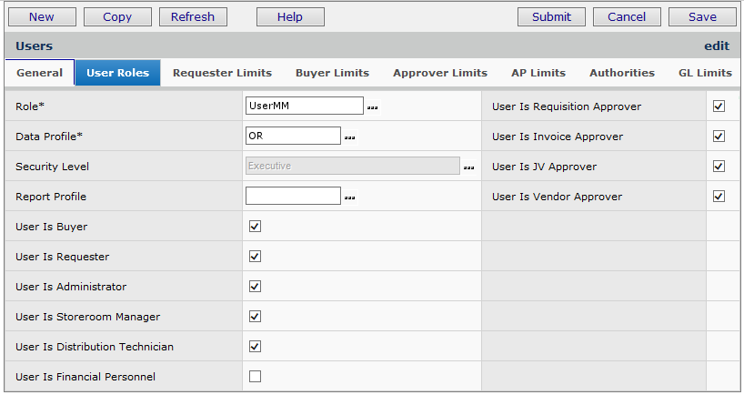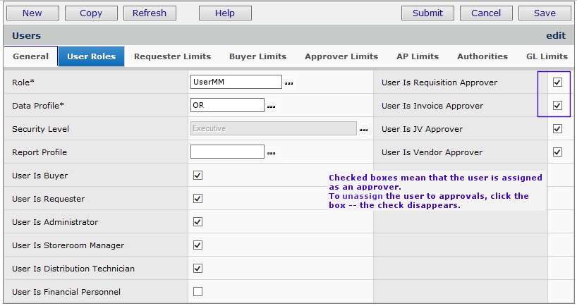 Requisition approvers are typically designated as buyers in their user profiles. User profiles also contain approvers' dollar limits.