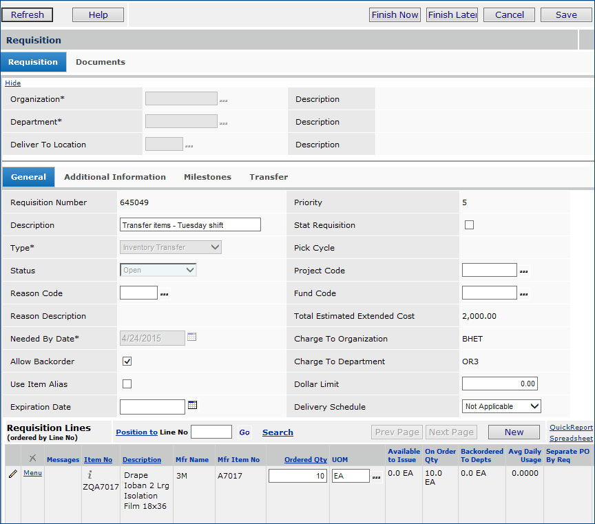 Figure 7 - Create New Requisition Panel - Transfer Tab