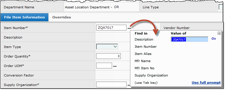 Figure 8 - Using the Prompt and the Find In Box to Locate an Item for a Transfer Requisition