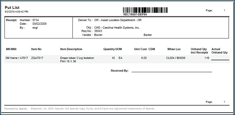 VI. Print a Put List for the Transferred Items at the "To" Location