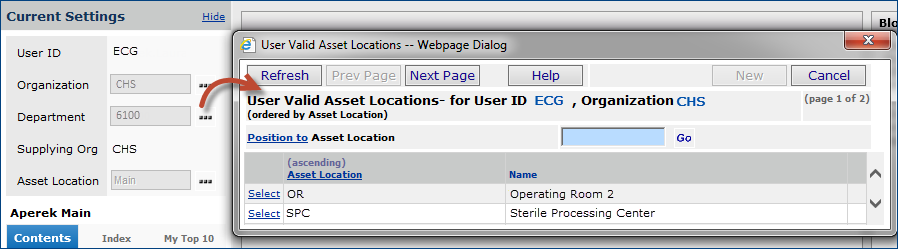 Figure 5 - Selecting the "To" Asset Location Department in Current Settings