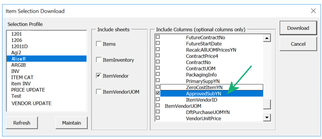 You can upload and download items marked as "approved substitutes" as part of the normal item maintenance process.