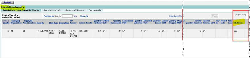 When a substitution is performed and a requisition is updated, the Substitution field is updated to Yes.