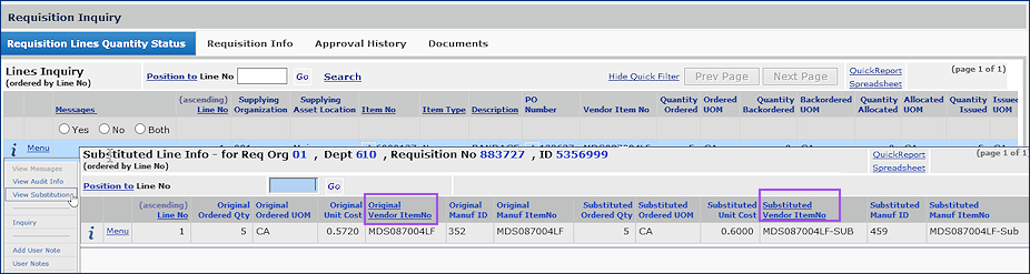 - For an approved item substitution on an EDI 850 PO, you can see the original item and the substitute on the requisition line.
