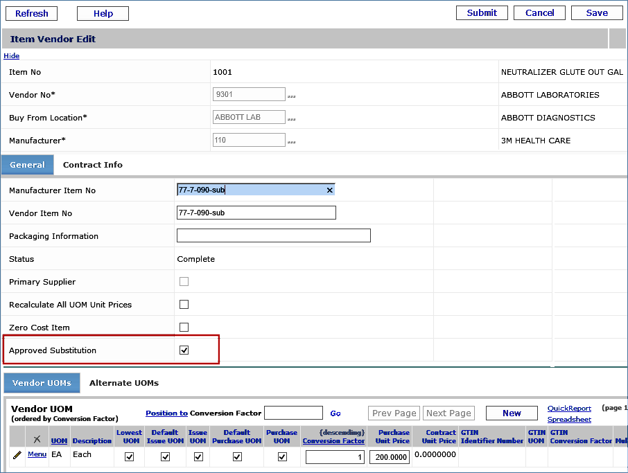 For each item that is a substitute for an original item, you must set up a new item vendor record (Figure 1). Both stock and non-stock items can have substitutes. Multi-sourced items can also have substitutes. The Approved Substitution field (Figure 1) on an item vendor record designates the item as an approved substitute.
