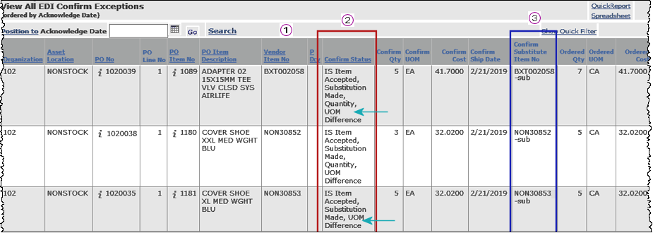 If a substitute item is not valid; for example, if it is not an approved substitute, or has a UOM, quantity, conversion factor, or other required attribute different from the original item, the EDI 855 is in exception, and is available on the EDI Confirm Exceptions list.