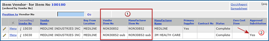 The Approved Substitution flag can be set for any item vendor record, including multi-sourced items. Multiple item vendor records can be designated as substitutes for a single vendor item, since the application looks to match the VIN in the EDI 855 and a VIN in one of the approved substitutions for the same catalog item.For detailed instructions on working with item vendor records, see the online documentation topic "To edit an existing item catalog vendor record or add a new item vendor record." Below is a summary that creates substitute items using the item catalog menus. For multi-sourced items, you can also set up substitutes from the item inventory menus.