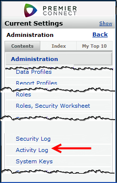 From the main Table of Contents, select Administration. From the Administration menu, select Administration; then choose Activity log. (See Figure 43.)