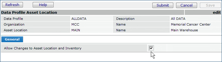 The field Allow Changes to Asset Location and Inventory (Figure 11) on the Data Profile Asset Location panel controls the user's ability to edit asset location records and item inventory records for an asset location.