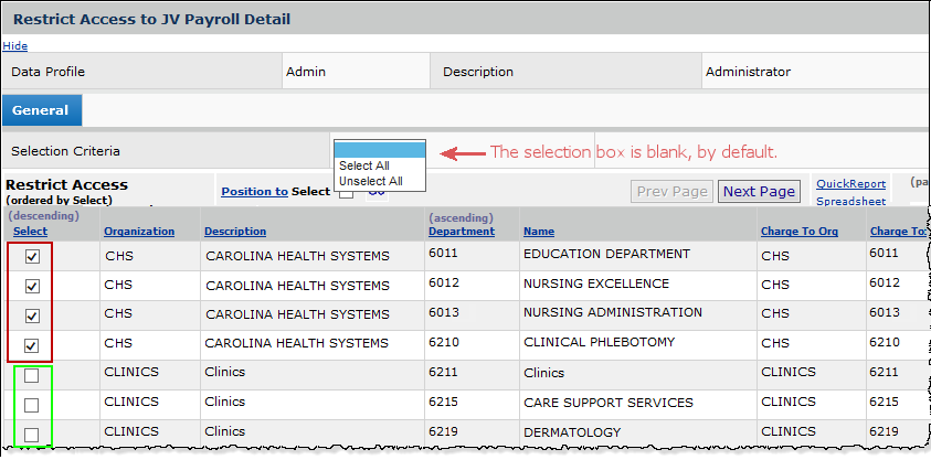 Select the checkboxes next to any departments that you wish to include in the data profile. Users assigned to the data profile will have access to information for the departments selected.