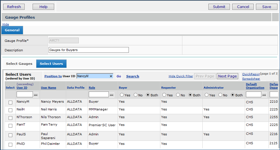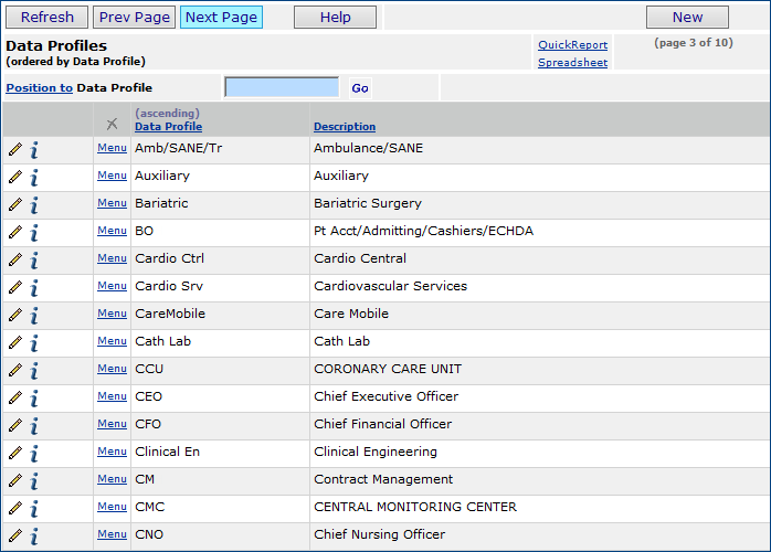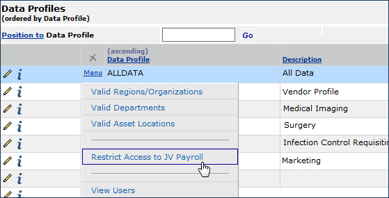 Data profiles specify the region, organization, department, and asset location data that a user may access. For example, a buyer's data profile identifies which organizations/departments the buyer can make purchases for. Each organization and department in a hospital has its own data records.