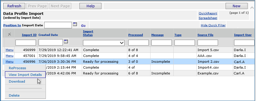 Each import has a Menu that lets you Reprocess, View Details, Download or Delete an import file.
