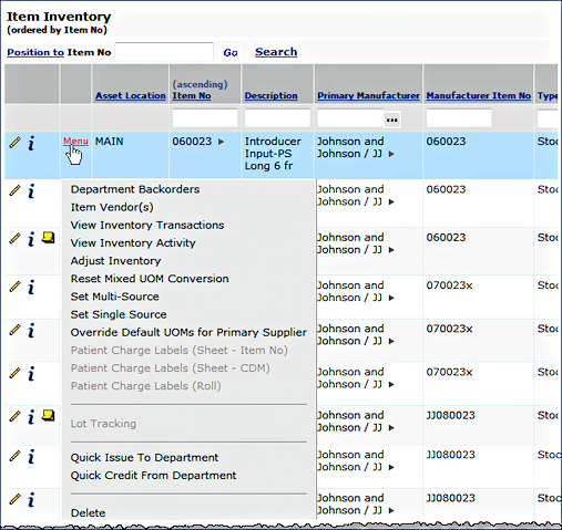 The field Allow Changes to Asset Location and Inventory also controls access to these menu options from the Item Inventory - All Locations menu (Figure 12):