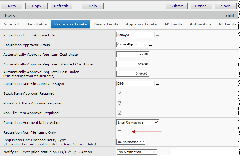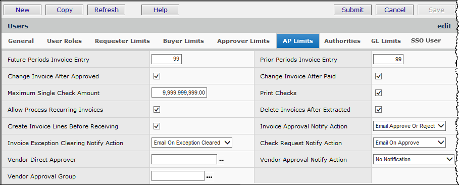 Compare the AP Clerk role to the Buyer2 role. Buyer2 has the setting All for the "Vendors" role object. Buyer2 can edit vendor records, but can also create vendor records, as specified by the check in the row Add Vendor Select Type\ New*.