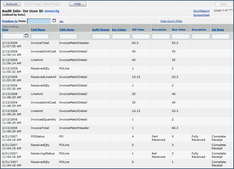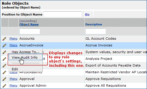 - View Audit Info -- displays changes to any general characteristics of the role.