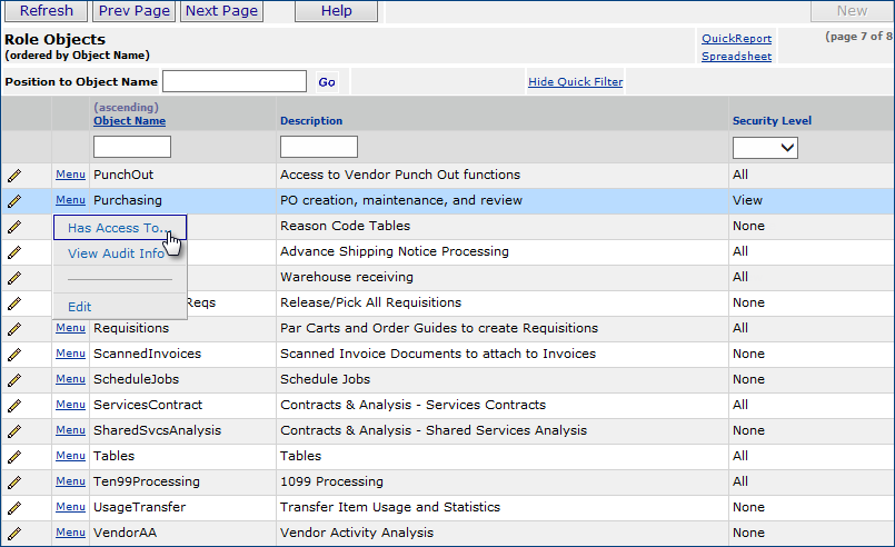 To view the actions/features allowed by each role object, click Menu > Has Access To... next to any role object in the list (Figure 2). The allowed actions/features for the role object appear (Figure 3). Figure 3 displays the first page of accessible actions for the Purchasing role object in the DistributionClerk role.