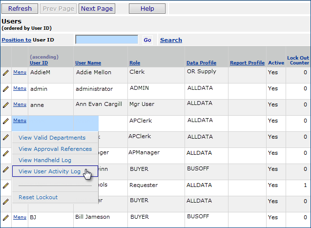 System administrators can view a log of all users' activities with the system through the Administration menu. User Activity data is retained for seven days before it is purged.